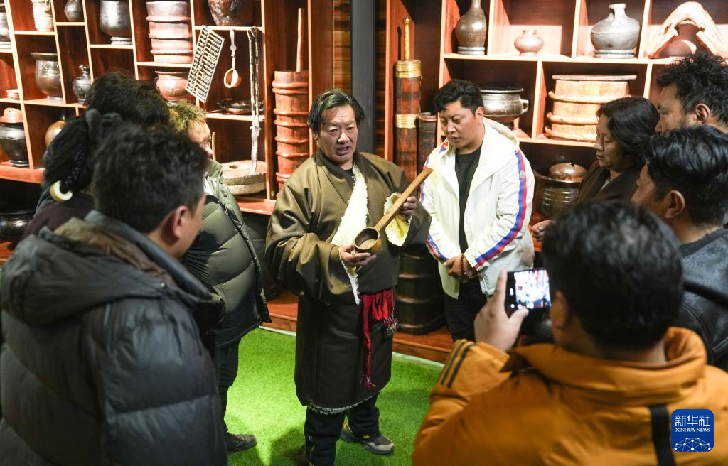 當(dāng)?shù)孛袼讓<邑暡悸逋ㄖ凶螅┰凇澳寥藢殠?kù)”藏式茶館給顧客講解館藏物件(2月13日攝)。新華社記者 晉美多吉 攝