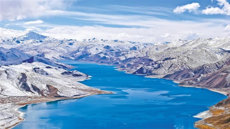 圖為鳥(niǎo)瞰羊卓雍錯(cuò)。記者 洛桑平措 晉巴次成 攝